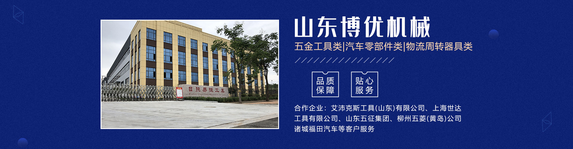 分公司日照易捷工具制造有限公司坐落在山東省日照市五蓮縣工業園,占地65畝(五蓮縣日照路與人民路交匯處),現有員工60名。公司主要產品有五金工具類及汽車零部件類、模具制作等三大系列。 主要設備有加工中心、數控車床生產線、磨床、研磨機、拋光機、冷鐓擠壓成型機、數控液壓模鍛錘等機械加工設備140余臺套。公司主要為艾沛克斯工具(山東)有限公司、上海世達工具有限公司、山東五征集團、柳州五菱(黃島)公司、諸城福田汽車等客戶服務。公司多年被評為優秀供應商。